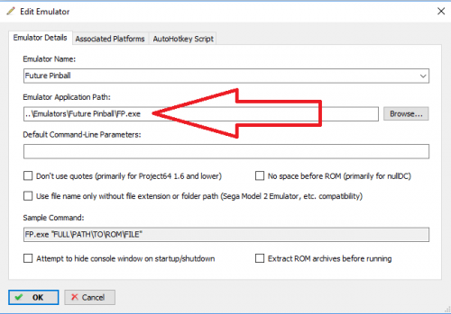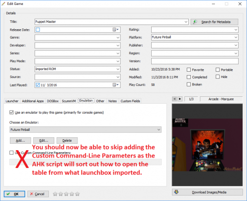 The Problem: Future pinball requires the /open "Drive Letter:\full path\table_name.fpt" /play /exit commands to be specified individually for each table, otherwise the table will not load. Launchbox currently will not launch Future Pinball on its own without doing a little extra work in each table's settings. You have to manually enter this on each table which can be time consuming if you have a lot of tables to load.