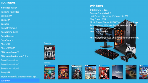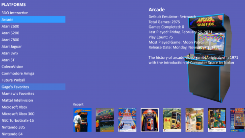 In the screenshots, I tried showing the different Platforms first, then the Wheel Games, then the Text Games views. There is also one screenshot of each platform that is without the hillbilly using the Un-hillbilly video borders. The video shows more.