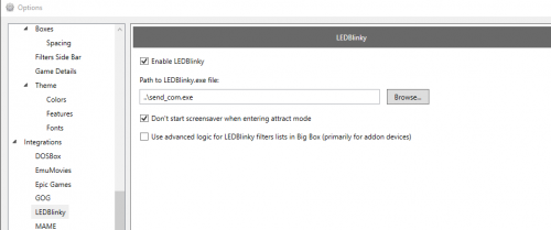 See the screenshot for the LaunchBox LEDBlinky settings. Browse to where you put the send_com.exe file, your path will not likely be same as mine.