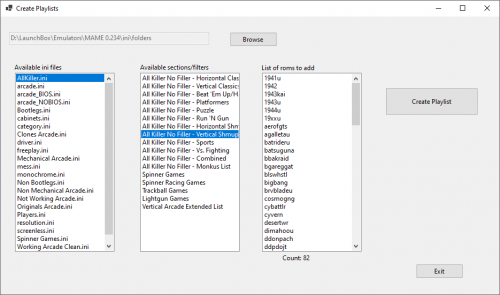 Have your cake and eat it too! The All Killer/No Filler lists found on BYOAC, and more recently adopted by our own @Lordmonkus on the LB forum are really nice lists, but they were never intended for collections that have full rom sets. I mean the whole idea of All Killer/No Filler is to pair down your collection to have only the best games. This ini file will let you create All Killer/No Filler Playlists from your existing full MAME rom set. When finished importing, you can browse your paired down playlists of only the best, or switch over to the full set whenever you like.