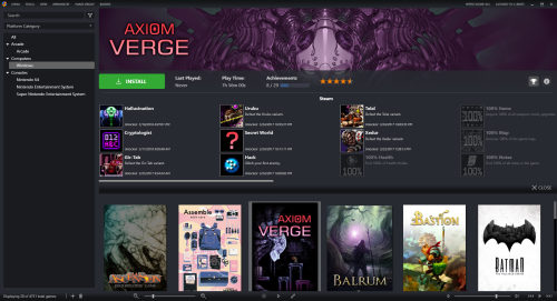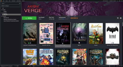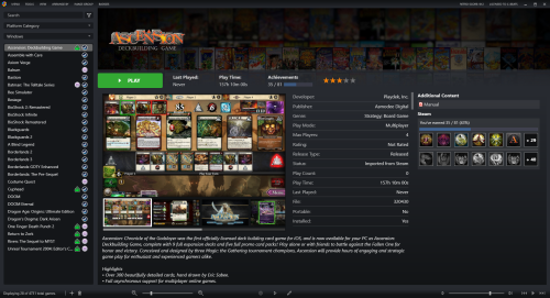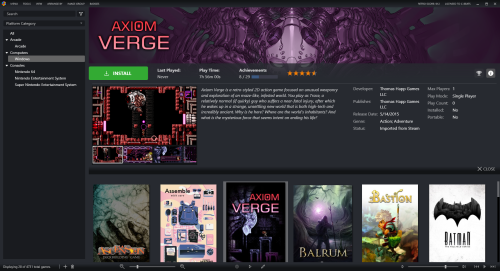 - Image View Game Details is horizontal similar to the Steam UI and utilizes a shelf system to drop down game details, achievements, and leaderboards