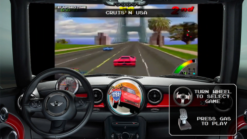 There's only one view - an in-cockpit view of a car. Moving the wheel right and left selects the active game.