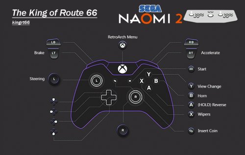 | The King of Route 66 kingrt66 | -Motor Power in the Test Menu needed turning off (NO-USE) for this game to boot. -CB-MIC has been disabled (NO-USE) in the Test Menu as this isn't emulated. -Auto-Acceleration has been turned off. This was for kids who couldn't reach the pedals in the OG cabinet. -Analogue Volume correctly adjusted for 1:1 analogue range with a controller. |