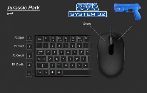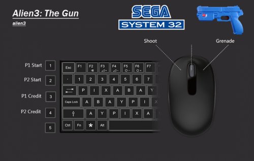 Controls: -Setup for 2 controllers or 2 mice. You can also use 1 controller and 1 mouse for 2 players. Test/Service Menu: -Due to this game having 'main' and 'slave' pcbs for their respective screens, both need to be configured separately. -Gun vibration disabled. -Difficulty changeable. Using 'normal' defaults. -Free Play set |