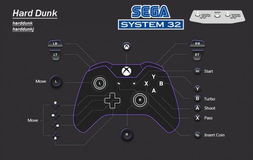 Controls: -Everything was straight forward. Dual Screen Setup: -The parent version 'harddunk' has been setup for 1 screen/1-3 player use (on the same team) -The clone version 'harddunkj' has been setup for 2 screens/2-6 player use (multiplayer versus) -For multiplayer, when using 1 screen you can only play on the same team (1-3 Players). If you want to play on opposing teams you need to use dual screen, as the 2 opposing sides have a dedicated screen. Test/Service Menu: -Advertise Sound set to ON. -Difficulty & Time changeable. Using 'normal' defaults. -Free Play set |