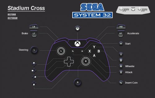 Controls: -Everything was straight forward. Dual Screen Setup: -The parent version 'scross' has been setup for 1 screen/1 player use. -The clone version 'scrossa' has been setup for 2 screens/2 player use. Test/Service Menu: -Volume Adjustment is here but not needed as defaults are fine. -Advertise Sound set to ON. -Difficulty changeable. Using 'normal' defaults. -Free Play set |