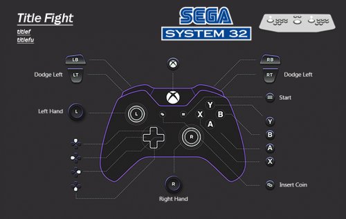 -This game used two, 8 way digital joysticks per player. The player would use these like they are throwing punches. This is of course bound to the left & right stick. -To duck left or right you'd have to move both joysticks in the same direction. -However, thanks to some clever configuring, this is now also on LT & RT. Making this way more playable. Dual Screen Setup: -The parent version 'titlef' has been setup for 1 screen/1 player use. -The clone version 'titlefu' has been setup for 2 screens/2 player use. Test/Service Menu: -Game time set to 3 mins. 1.5 mins is the default. -Advertise Sound set to ON. -Difficulty changeable. Using 'normal' defaults. -Free Play set |