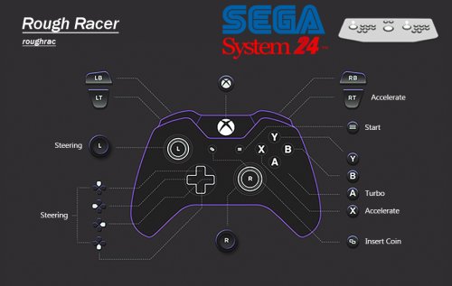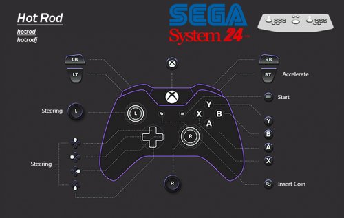 Rom Differences Info: -There is a 3 & 4 player version of this game. -The 3 player version 'hotrod' is also the 'Turbo' version. Your car goes significantly faster. -The 4 player version 'hotrodj' is the 'normal' version despite not being the parent. Your car goes at normal speed, and you get 4 players. -Using both is preferable as they differ. If I had to choose it would be 'hotrodj'. Controls: -Steering is on both the right stick and D-Pad. Using the D-Pad for these types of games can be preferable. So, both are usable. Dip Switches: -Language set to English for 'hotroj' version. -Free Play set |