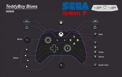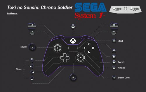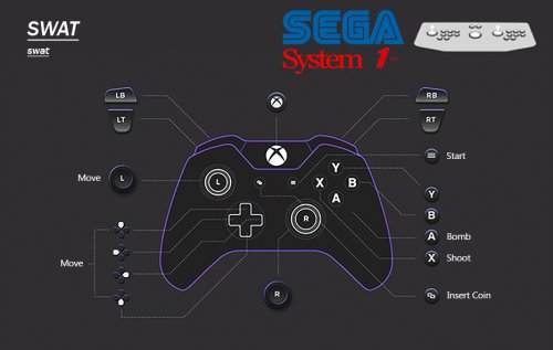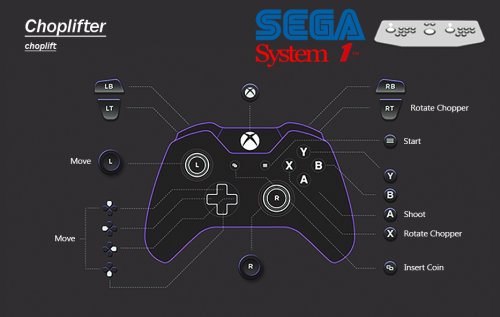 Controls: -'Turn Chopper' has been assigned to RT in addition to X. Using RT to turn the chopper makes it way easier to play as you can hold it AND still shoot. Dip Switches: -Difficulty & Lives changeable. Using 'normal' defaults. -No Free Play available |