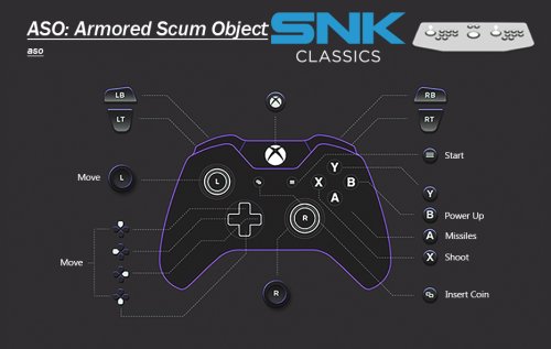 Game Info: -This game was called ASO in Japan and Alpha Mission in other regions. Both have been configured and a separate image created for both. Controls: -Nothing special to note. Some controls moved for easier play. Dip Switch: -Difficulty, bonus life changeable. Using 'normal' defaults. -All ships at start cheat is ON. |