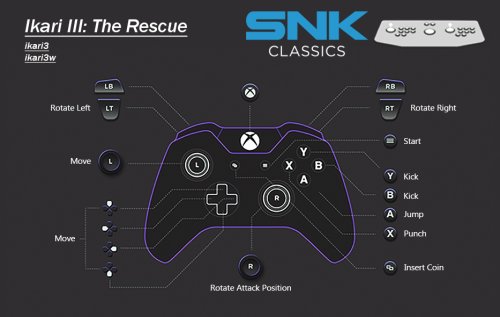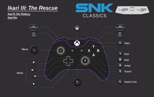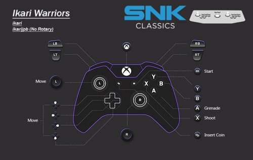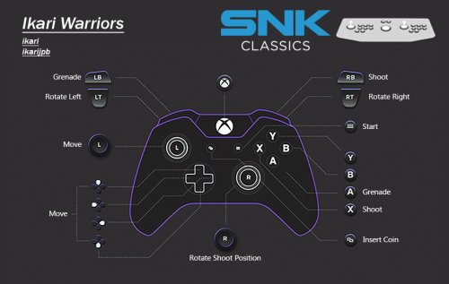 Controls: -Rotary joystick game. Mapped correctly so rotate is on the triggers or right stick. Using digital inputs for these is way better. -There is a joystick hack version 'ikaripb' that has been changed/hacked so you simply shoot in the direction you are facing. Completely removing the rotary aspect of the input. You may find this to be easier to play. However, the game was intended to be played while being able to 'spin' on the spot. -Both the original rotary joystick, and hacked non rotary versions have been configured. Dip Switch: -Difficulty, lives changeable. Using 'normal' defaults. |