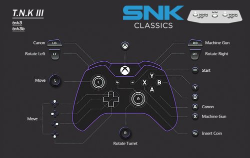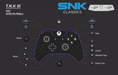 Controls: -Rotary joystick game. Mapped correctly so rotate is on the triggers or right stick. Using digital inputs for these is way better. -There is a joystick hack version 'tnk3b' that has been changed/hacked so you simply shoot in the direction you are facing. Completely removing the rotary aspect of the input. You may find this to be easier to play. However, the game was intended to be played while being able to 'spin' on the spot. -Both the original rotary joystick, and hacked non rotary versions have been configured. Dip Switch: -Difficulty, lives changeable. Using 'normal' defaults. |