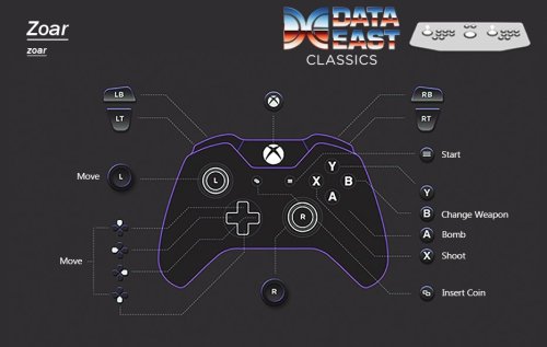 This game has a rotary input system. Spin your aim position by twisting the joystick. There is a hacked joystick version that simply shoots in the direction you are facing. Both have been configured. The Joystick hack is way easier to play. Controls: -Spin left and right is on the right stick and both triggers as digital inputs. This prevents auto centring. Dip Switches/Test Menu: -No Free Play |