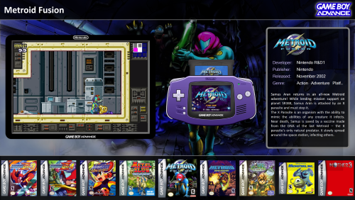 Just and edit I made specifically for the Gameboy Advance using All Night Long as a template. It is set under horizontal wheel 2. You may have to delete the texlistview in the theme folder to avoid a popup. You can change the background for each game by changing the fanart backgrounds.