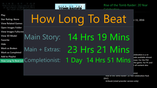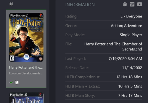 View how long it takes to complete a game and optionally save these times as Custom Fields for viewing in the game details. Also displayed are what other platforms (if any) the particular game is available on.