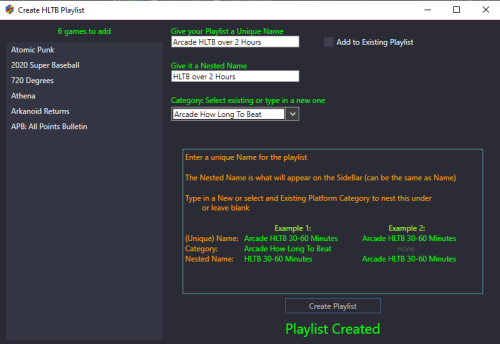 Playlists will be static. If you add more games to your collection, just add the HLTB times to the games Custom Fields (right-click game option) and then in the Playlist Creator, check the box Add to Existing Playlist. Select the playlist.