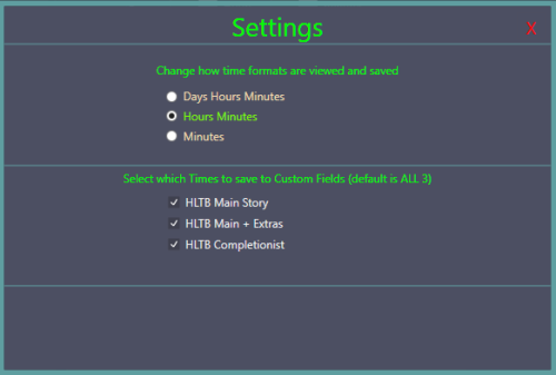 No longer provided. If platform data is unavailable, a Box-Front image is shown instead. - Select a radio button for how you want your times to be displayed and saved. (Days-Hours-Minutes, Hours-Minutes or Minutes only)