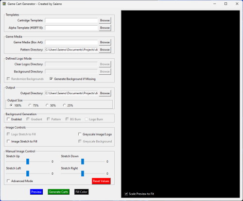 Game Cart Generator is a standalone desktop application for generating stylized cartridge or disc-based artwork. It's primarily for user-supplied template layers, clear logos or box art, and optionally background images or procedural backgrounds to compose polished output images.