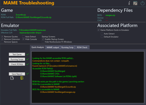 - Launches the game in MAME and captures the command window output that you never see. (Potentially useful 'Why the game isn't launching' data)