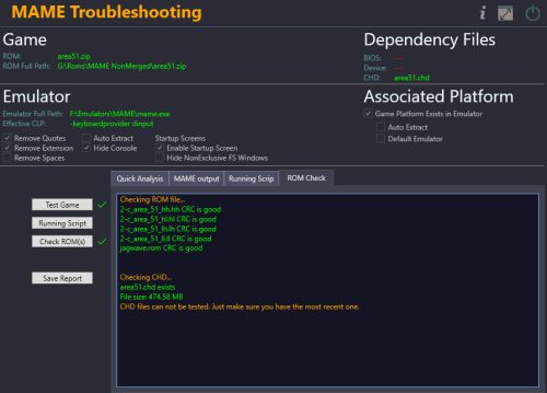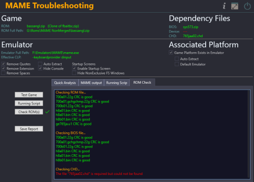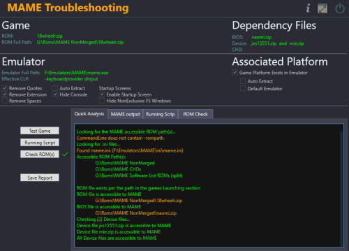 Verifies ROM and dependency (BIOS & Device) file(s) exists and are accessible to the emulator when launching**.