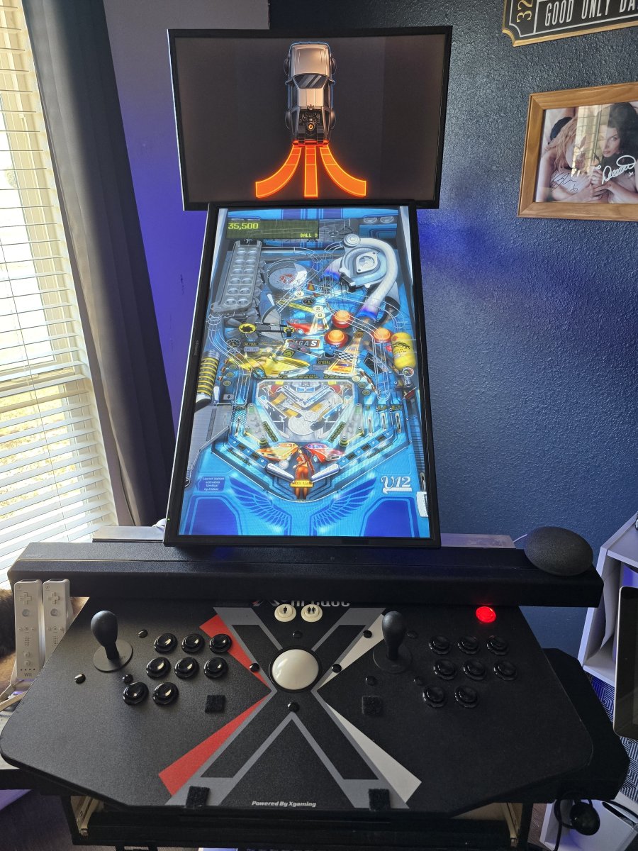 These are the latest (version... 6 I think?) images of my Arcade setup. I like playing slots so I designed it around that with no 'box' around it. The bottom screen rotates and tilts back to work better in Pinball mode. I basically wanted my cabinet to be multi purpose and hadn't seen anything I liked online, so I designed and built this myself.