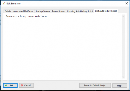 2. In the Exit AutoHotKey Script tab for Supermodel3, I inserted the line "Process, close, supermodel.exe"