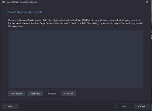 I have tried adding as folder and as files and like I said above I even tried to import a single file but at the end of the import it shows no game on list to import and the only way to add the game is by the add button when I right click on platform game list area and manually point it to the rom file not using the import function at all which means doing it one at a time as well as the image downloading. -