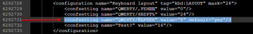 Me too. Here's what I found in that section: <configuration name="Keyboard layout" tag="kbd:LAYOUT" mask="24"> <confsetting name="QWERTY/,УЕИШЩ" value="0"/> <confsetting name="QWERTY/ЯВЕРТЪ" value="24"/> <confsetting name="QWERTY/ЙЦУКЕН" value="8" default="yes"/> <confsetting name="Test?" value="16"/> </configuration>
