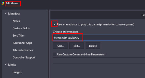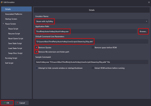3. With a Steam game, what's happening is as I described above. When you launch the via "steam://rungameid/248610", it opens steam THEN opens DoorKickers.exe. Also, what's happening with your script is it's ran BEFORE the main application (which is what you want) and the 1st thing it does is wait for DoorKickers to get closed (exited). Since at this point DoorKickers isn't even running, the script "is done waiting" and goes to the next line. Which is to shutdown/exit joytokey. You say "it doesn't seem to have any effect". Is it not even closing joytokey? Do you have a 2nd additional app (also set to run BEFORE) that's starting joy2key? I suppose you'd kind of have to. So, these 2 scripts [at this point] are butting heads. Easy fix, combine the 2 scripts. You'll want to (NEED to) add in a WinWait to wait for DoorKickers.exe to actually be running. THEN you can wait for it to close. Run, "D:\Utilities\JoyToKey\JoyToKey.exe" WinWait, ahk_exe DoorKickers.exe WinWaitClose ;WinClose, ahk_exe JoyToKey.exe **DOES NOT WORK WITH JoyToKey.exe** Process, Close, JoyToKey.exe The issue doing it this way is you need to create a different script for each game. Replacing DoorKickers.exe with the 'new' games [actual] executable. Which, beyond being tedious, isn't that big of a deal. EDIT: I am told (I've never used it myself) JoyToKey.exe is one of the few programs that require "extra force" when closing. WinClose will not work. You need to use: Process, Close, JoyToKey.exe Codes has been edited to reflect this change. Another option is to create a new "emulator" which is actually an AutoHotkey script used to launch your Steam games. It's a onetime setup and will work for all your Steam games that are launched via "steam://rungameid/xxxxxx". The script would look something like this: Run, "D:\Utilities\JoyToKey\JoyToKey.exe" ;**** Verify Path **** Run, "C:\Program Files (x86)\Steam\Steam.exe" -applaunch %1% ;**** Verify Path **** isRunning := "0" While (isRunning = "0") ; Wait until the game is launched RegRead, isRunning, HKCU\Software\Valve\Steam\Apps\%1%, Running Sleep, 500 While (isRunning = "1") ; Wait until the game is closed RegRead, isRunning, HKCU\Software\Valve\Steam\Apps\%1%, Running Sleep, 500 Process, Close, JoyToKey.exe In LaunchBox add a new emulator. Use (Browse.. to) AutoHotkey.exe that comes with LaunchBox as your Application Path, so you don't have to install it. (LaunchBox will convert it to a Relative Path, as shown.) Point to the script as your Default Command Line. ("Put this path in quotes.) Check BOTH boxes. Save. Set the Steam games you want to use JoyToKey with to use this emulator. If you want all your Steam games to use JoyToKey, when creating the "emulator", go to the Associated Platforms section, select "Windows" (or whatever you've named the Platform, default is "Windows") under Associated Platforms and check the box Default Emulator. Skip the above Edit Game all together.