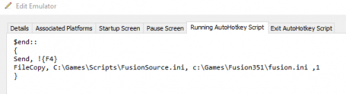 Try putting it in the "Running AutoHotKey Script" tab for your Fusion emulator. Also, I'm not sure if it's going to know what "A" is, in this case. So just send what you want. $end:: { Send, !{F4} FileCopy, C:\Games\Scripts\FusionSource.ini, c:\Games\Fusion351\fusion.ini ,1 } -
