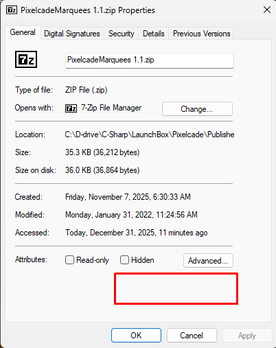 Did you right-click the dll file, select Properties and check UnBlock? If there is an unblock option, it will be located here: What version of LaunchBox are you running? And you are selecting a game and right-clicking the game to find the plugin in the menu? (have to ask ) To clarify, you placed the file into /LanchBox/Plugins/Pixelcade/PixelcadeMarquees.dll (which will be fine) Download version 1.0. Open the zip file and copy everything in its PixelcadeMarquees subfolder EXCEPT the dll file, into where you placed the v1.1 dll file. So your /Plugins/Pixelcade/ will contain v1.1 of the dll file, pixSettings.xml (file) and the ffmpeg folder. (When I added the v1.1 update (over 2 years ago), I neglected to add the settings file and the ffmpeg folder/files)