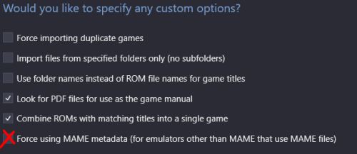 When you get to the Options screen, try checking "Force using MAME metadata...". Assuming your using MAME type ROMs.