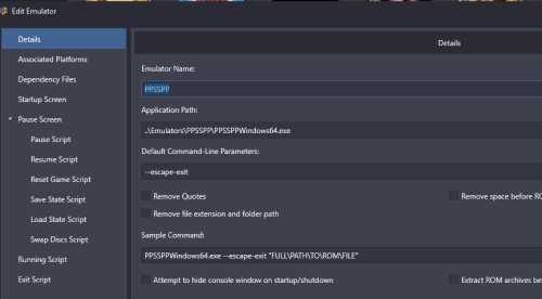 Here's how mine's setup: And then in my F:\Emulators\PPSSPP\memstick\PSP\SYSTEM\ppsspp.ini file, I have FullScreen = True. (You'll have to scroll down and find it and make sure it's set to True.) Though I suppose you could just add --fullscreen (2 dashes) to the command line. That may be easier. -