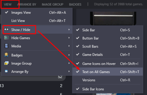 View < Show/Hide - Text on All Games (or Ctrl+Shift+T). But it won't show the File Names. Just the Game Title. The games File Name can only be seen in the Game Details [right] panel. To enable showing those, go to Tools < Options < Visuals < Game Details and check the box for File.