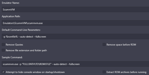The game(s) should be pointing to the games' folder (vs. a file). So check that. (Edit game, Launching) Then of course, the emulator is set to ScummVM. (Emulation) For the emulator, the default command-line parameters should be (or at least this is what mine's set at) -p %romfile% --auto-detect --fullscreen