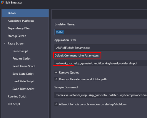 An example of one of those might be -config "D:\emulators\myEmu\Configs\%romfilename%.ini" "FULL\PATH\TO\ROM\FILE" Where you need both boxes un-checked, but need the ROM filename for a config file.