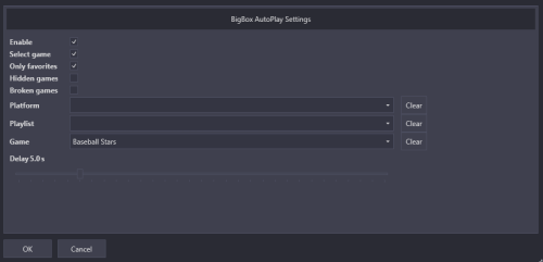 Big Box Auto Play View File https://bigboxautoplay.readthedocs.io/en/latest/index.html BigBoxAutoPlay BigBoxAutoPlay is a plug-in for BigBox that can automatically launch into a game when BigBox starts up Installation Download the latest version of the plugin Copy BigBoxAutoPlay.dll and Prism.dll into the LaunchBox\Plugins folder Settings A new menu item is added to LaunchBox under Tools > Configure BigBox AutoPlay. Enable Check the box to automatically play a game when BigBox starts. Uncheck the box to disable the auto-play plugin. Select game Check the box to have launch box select the game in the UI before launching it. This should allow the marquee to display properly for the selected game. Only favorites Check the box to filter the randomly selected game to only include favorites Hidden games Check the box to include hidden games Broken games Check the box to include broken games Platform Optional. To filter the randomly selected game to only games in the selected platform. Playlist Optional. To filter the randomly selected game to only games in the selected playlist. Game Optional. To specify a specific game to auto-play. This list is filtered based on the selected platform and/or playlist. Delay Specify the number of seconds to delay before launching the game. When a startup video is used with BigBox, this delay can help the auto played game from launching behind BigBox by giving BigBox a chance to fully initialize before launching the game. Link to GitHub repo https://github.com/AtomFry/BigBoxAutoPlay Submitter Fry Submitted 12/23/2021 Category Third-party Apps and Plugins