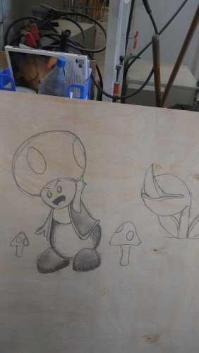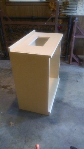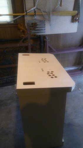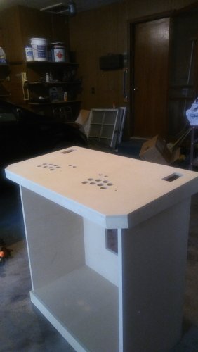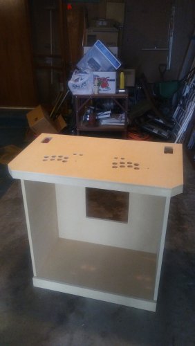 Doing a bit of a minimalist approach this box in not real deep and only tall enough for the average man, around 36 inches tall. I already have the PC built and the controls are waiting to go in. I currently have the top of the box out to a friend who is doing custom hand painted graphics. When the lower box is done he will add art to that as well I will update when I have more. The squares in back are for speakers and it will display on an LCD TV mounted to the wall. The front door is not installed yet.