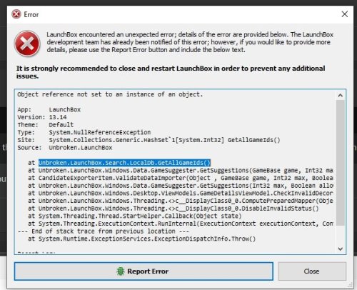 I am getting this error when I try launching any game. If I press Close, Launchbox disappears!! 13.14