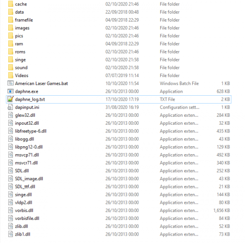 I will see what my setup does if I remove -sound_buffer 2048 and the -opengl entry. Maybe both are redundant I am not sure. \\Launchbox\Emulators\American Laser Games\ contains the following on my system... (if you need to check .dll files). Could it be a .dll that is needed ? Your error log says WARNING: Audio device could not be opened: DirectSoundCreate: No audio device found which is rather odd given it managed to find it when running in a Window. The following folders are totally empty.. data, framefile, ram, roms, videos