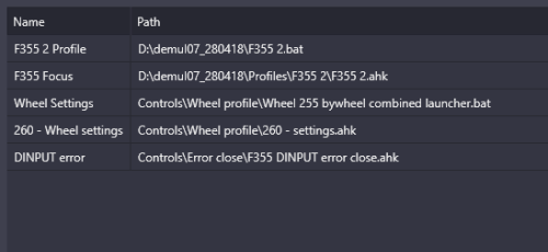 One of the frustrating things about Thrustmaster wheels and trying to emulate multiple arcade games, is that there is no way within the Thrustmaster UI to set custom profiles per game for the force feedback, pedal settings (combined or separate) or the wheel rotation angle. Take my preferred settings for the following 4 games for example: - Sega Rally - Sega M2 emulator. Pedals set to combined, a 260 wheel rotation angle and 60% FFB. - King of Route 66 - Flycast stand-alone emulator. FFB to be much stronger to make me a real trucker :-). Centre force applied by the wheel. - Burnout Revenge - xbox 360 Xenia-Canary. 120 wheel angle as my wheel is replicating the Xbox analog stick (via x360ce app), with centre force applied by the wheel. - Asseto Corsa - PC. Much higher 900 wheel angle for this modern driving sim and for the FFB centre force to be performed by the game It's a pain in arse to set these manually every time and a single 'best-fit' profile doesn't really cut it if you want an enjoyable experience from any of these games on your Thrusmaster wheel. There's a solution to this requiring 2 separate processes; one for the FFB gain/pedal settings and one for the wheel angle. You can run these process before the game launches in Launchbox that will then apply your preferred wheel settings automatically. I'm using Thrustmaster TC-PC racer with the TCLM pedals - I believe on the latest firmware. This wheel is DINPUT only. Other Thrustmaster wheels may utilise a slightly different Thrustmaster UI but the following principles should be the same and you can adjust any of the scripts or file paths accordingly. Not sure this will work though if you have a wheel that can be set to XINPUT (i doubt it). FFB Gain / Pedal settings: EDIT - NO LONGER WORKS SINCE LATEST 2023 DRIVER UPDATES - See comment below I got this from: Unfortunately, this method still doesn't let you automatically set your wheel rotation angle (we'll come on to that later). Essentially what they did was find the reg-edit location for the wheel settings, then manually saved/copied a profile there each time before a new game is loaded. However, batch files can do this part for you automatically. Your wheel will have it's own specific identifier but here's what worked for me. I needed about 6 different profiles to cover all of the different settings I wanted for all the games I like to play. First off. find where your wheel saves it's setting to. Type reg-edit in your windows search bar to load up Registry Editor. For me my wheel settings are held here - but this is specific to my device: [HKEY_CURRENT_USER\System\CurrentControlSet\Control\MediaProperties\PrivateProperties\Joystick\OEM\VID_044F&PID_B689\OEM\JoystickSettings\682760004] This is specific to my wheel and Windows only. When i recently moved to a new PC with the same wheel, the old numbers from similar path were different and it no longer worked until i edited all my scripts with the new path - you will need to use your own location/extension. Once there, right click on the last bit (682760004 for me) and export. This might be saved as your main default wheel settings. Save the exported file to a folder in the Controls folder in your Launchbox folder (i call mine Wheel Settings). Go back to the Thrustmaster UI and make the new setting you want for the next profile/game - pedal settings on the first tab and gain settings (on the 3rd tab). Save and exit. Go back to reg-edit and export the same folder again - creating a new file now for that profile. Save the new exported file as something memorable for the profile you want to apply. So i have 'bythewheel combined' which i apply to all my Sega M2 games, but 'bythegame-separate' for my modern racing sims. Repeat for each profile that you want to set that will cover all the games you like to play (i think i have about 6 different pedal/FFB combinations as my go-to's at the moment). Don't worry about rotation angle yet - just concentrate on profiles for separate/combined pedals and preferred feedback strength and centre spring for each type of game.. I did, and wasted time setting angles in these profiles that didn't update any way. I cant be bothered to rename them - so some of my examples below might look a bit confusing but just make sure you know upfront the type of thing you want to set and good naming conventions for them.This will create a .reg file for each export - If you right click to edit this file, it should look something like this: Windows Registry Editor Version 5.00 [HKEY_CURRENT_USER\System\CurrentControlSet\Control\MediaProperties\PrivateProperties\Joystick\OEM\VID_044F&PID_B689\OEM\JoystickSettings\682760004] "DefaultWheelAngle"=hex:ff,00,00,00 "DefaultSpringIsPersistent"=hex:00,00,00,00 "DefaultSpringStiffness"=hex:88,13,00,00 "OverallGain"=hex:64,19,00,00 "SpringGain"=hex:10,27,00,00 "DamperGain"=hex:10,27,00,00 "InputAxisRemap"=hex:00,00,00,00 [HKEY_CURRENT_USER\System\CurrentControlSet\Control\MediaProperties\PrivateProperties\Joystick\OEM\VID_044F&PID_B689\OEM\JoystickSettings\682760004\0] [HKEY_CURRENT_USER\System\CurrentControlSet\Control\MediaProperties\PrivateProperties\Joystick\OEM\VID_044F&PID_B689\OEM\JoystickSettings\682760004\1] You can test out if this work by double clicking one of these files and then going to your Thrustmaster UI to see that the new wheel settings have taken effect. You’ll get a Windows message when you do this that you'll need to ok - but this can be turned off (i can't remember how at the moment, but will add later once it comes to me - i think it was either an option to not see it again in the message itself or it just doesnt happen when you use the launcher .bat file below for each profile so doesn’t interfere visually with the game bootup process. But select yes when your testing this out). Now for this to be automatic, you also need to set up additional .bat files for each profile. You can do this in Notepad, saving it as a .bat file extension. When saving, cal