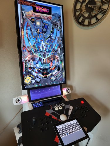 Here's how it looks today. It's primarily set up to play Slots, but here it is with Pinball FX running. The mini marquee screen is running the BigBox startup video. The lowest screen is only used for booting and the tablet (right of the stream deck) usually just shows another desktop, but it's off right now. The iPad has a windows keyboard / mouse that can also be used for touch controls for games, when needed.