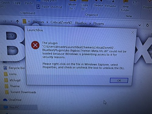 I just ran some updates to both Launchbox and Windows and now receive a DLL error when attempting to start BigBox. I'm told that Windows is preventing access to a DLL file in the Launchbox\Themes\Critical ZoneV2 - Blue Box\Plugins directory for security reasons. The specific DLL in question is Ao.Bigbox.Themer-meta.vlc.dll, apparently some sort of VLC DLL. The dialog box says to right-click the file in Windows Explorer, open its Properties, and then uncheck the block box. The only problem is I don't have anything that looks like that when I look at the file's properties. Not sure if this was caused by a Windows update or the new Launchbox, but everything was working the last time I turned the system on before updating both.
