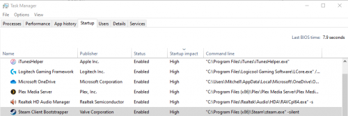 Another possible solution includes trying to figure out how to use the -silent launch command for steam client. I never added the command onto my program, but you can see here in my Task Manager Startup tab that it is being used. I looked into my startup folder by going Run > shell:startup, but I don't find the Steam shortcut for start up there. In fact, I don't really know where its located. If you know, then maybe we could try to figure something out so that your system boots up with Steam client in the tray like mine does.