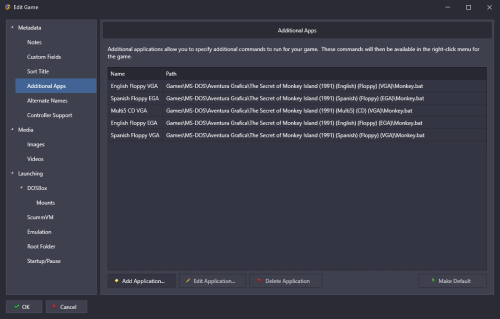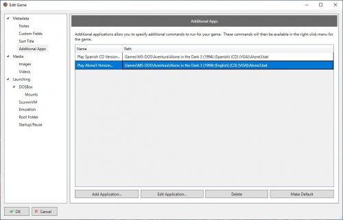 Hello all, I'm trying to set my MS-DOS collection up and running inside Launchbox by parsing the games which have, each one, their own .CONF file that makes them self-contained. Launchbox finds the games, the media and the .CONF files correctly. Thing is I (sometimes) have multiple region/language versions of the same game and I would like to combine them. Each game is in its own folder using the naming as follows: Alone in the Dark 3 (1994) (Spanish) (CD)\dosbox.conf Alone in the Dark 3 (1994) (English) (CD)\dosbox.conf The issue is that once the games are combined, they appear under "additional apps" but the .CONF folder path field (inside "launching\DOSBOX" becomes unique, so it's not possible to define one for each "additional app". I've tried to set up a .BAT file that will call a certain version of DOSBOX and launch the specific .CONF file inside the game folder, but when I try to set each version ("additional app") to use its respective .BAT, when launching the game Launchbox reverts to the "DOSBOX ECE" version and fails to launch anything. If I separate the games and point the "application path" inside "launching" to the .BAT file, it works flawlessly. I've unchecked "use DOSBOX to play this game..." under "launching\DOSBOX" I don't know if I'm doing something wrong or it's just the feature wasn't meant for MS-DOS games and only for "true" versions of a ROM. Thanks