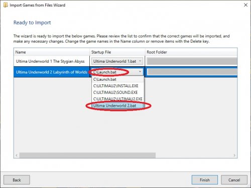 Hi there! I wanted to point out a bug that's been present for some time (unless I'm doing something wrong). When I try to import DOS games by drag and dropping, I get to the window where I am offered to choose the "Startup File" to be used. Launchbox scans for executables inside the game's folder and lists them in a drop down menu. Thing is, no matter which one I choose, Launchbox always reverts to the one it had assumed was the correct one. In my case, I'm using a .BAT file for each DOS game with a simple startup menu, and I want that one to be used for launching the game. Please see screenshots: By default, Launchbox goes for the first (usually) "launch.bat" which is present in each and every game I'm curating (my own simple startup menu). In this case "Ultima Underworld 2.bat" is the desired entry point which calls the specified DOSBOX version (Vanilla, ECE, Staging, etc.) and loads the default config file, adding the game's specific config file for potential overrides and fine tuning. See the import result where the import wizard has ignored the input indicating the "startup file" and reverted to its initial finding, forcing me to manually change the "application path" to the desired .BAT. Thanks for this wonderful piece of software!