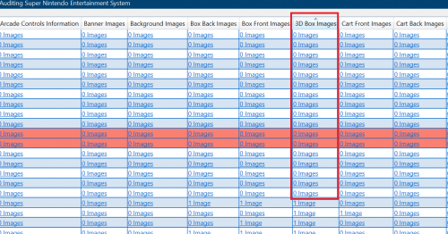 I just tried your suggestion, but it does not seem to work. I deleted every file in 3D box images for SNES and copied 742 images I downloaded into the folder. Then I refreshed the SNES library images. After that I audited the SNES library. So far so good, however, the results of the audit are incorrect. The audit shows only very few games with "0" 3D Box images, when in fact only 742 games of the 1785 in my collection actually have 3D Box images. I don't know what's wrong here. Any suggestions? EDIT: When I click to check on some of the images listed in the list above, many of them are not 3D box Images, but they are listed as such.