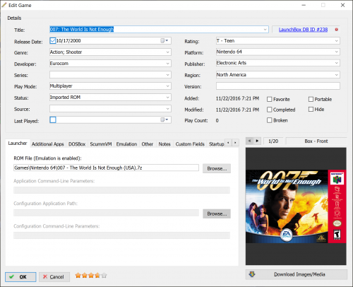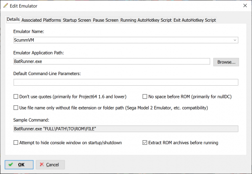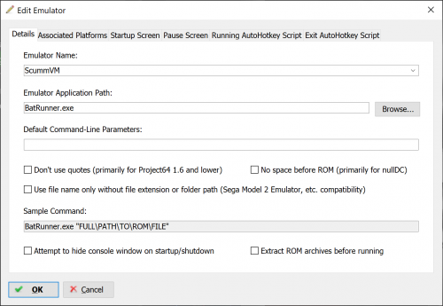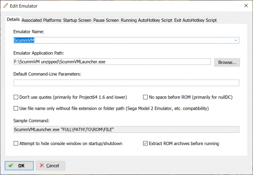 I only have time to work on my system every now and then. This week I decided to add some additional platforms. This is similar, but a little different from another recent post regarding N64. As was the case with that post, I followed the ETA prime video. (Due to the age of the vids and constant changes in emulators, etc, nothing ever seems to be exactly what you see in the vid.) One hiccup that I had was that the video provided instructions for the exe, but when you go to the EpicFail post, the download is only for a dll file. After I kept reading, I found the original exe. but again, what to do with the dll was not entirely clear. Anyway... I followed the instructions and attempted to import the roms. Everything looked normal, however, 0 roms imported. I did the same process but used a different set of roms. This time it worked, but when I tried to launch a game from LB I got the same error as with N64.. First, I said a few curse words, then, I did some more research and realized that the dll file needed to go in the plugin folder. So I put it in the plugin folder and unblocked it. Next I tried to run it from launchbox. I no longer got the error above, I just get the "Now Loading" screen and then it just goes back to launchbox. If I open SCummVM and run a game from there, it works. All of the artwork looks correct. I'm starting to wonder if something is up with my launchbox build. I'm running the most current version. Here are a few Emulator edit screens... Note: The launcher is in the same folder as the games per ETA primes instructions. One more thing... after I got the plugin in the right place I went back and reloaded the ini and updated the batch files. The batch files are in the Launchers folder in the games folder. Any one have any suggestions? As always... any help is appreciated!