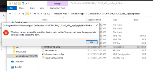 Is there anyone out there who has actually successfully imported individual tables with FX3 purchased through the Microsoft Store (not Steam)? I flawlessly imported FX3 after I installed it from the Microsoft Store, but when I did this Launchbox sees it as a Windows game, and all I can do is launch the game and navigate from there. The tips above act like the .exe file is accessible and simple to find. Windows hides FX3 in a hidden directory WinApps, but it won't let me open it despite what permissions I may grant myself. So entering it into the emulator creator won't work. Here's where it is: And here's what happens when I try to open it: Has someone actually gotten the launch-individual-tables to work for FX3 purchased through Microsoft? If so how did you accomplish this? Thanks. Scott -