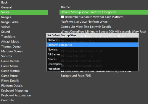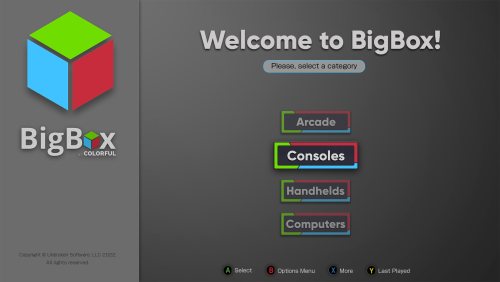 I was wondering why we can't have a home screen where we can make a first choice after opening BigBox... ๐คจ It doesn't have to be mandatory. But it would be really cool if we had a welcome screen with a list of the main categories, for example: Welcome to BigBox "Colorful" ! Please choose a category below or press X to continue where you left off: Arcade Console Computers Handhelds Pinball ... I believe, for a paid product more than a decade old, we should be evolved. Please, consider!